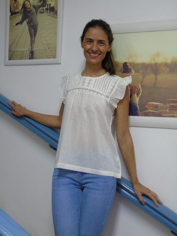 Blusa blanca sin mangas con encaje y botones en la espalda. Talla única