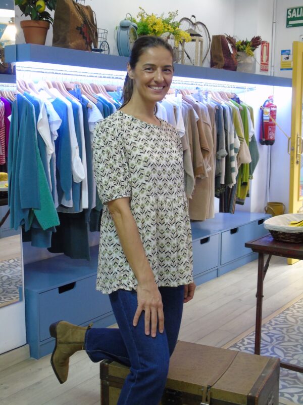 Blusa estampada de manga corta estilo romántico, con manga abullonada y cuello a la caja