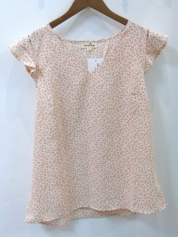 Blusa de florecitas en tonos rosa claro, con volante en la manga y escote en pico. Tallas S, M y L