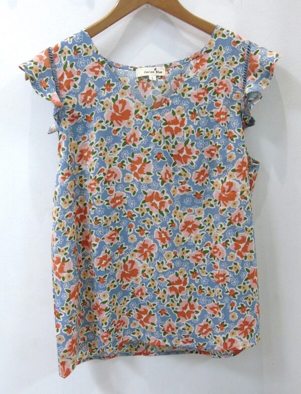 Blusa estampada de flores en tono azul, coral y rosa con volante en el hombro y escote en pico. Tallas S, M y L