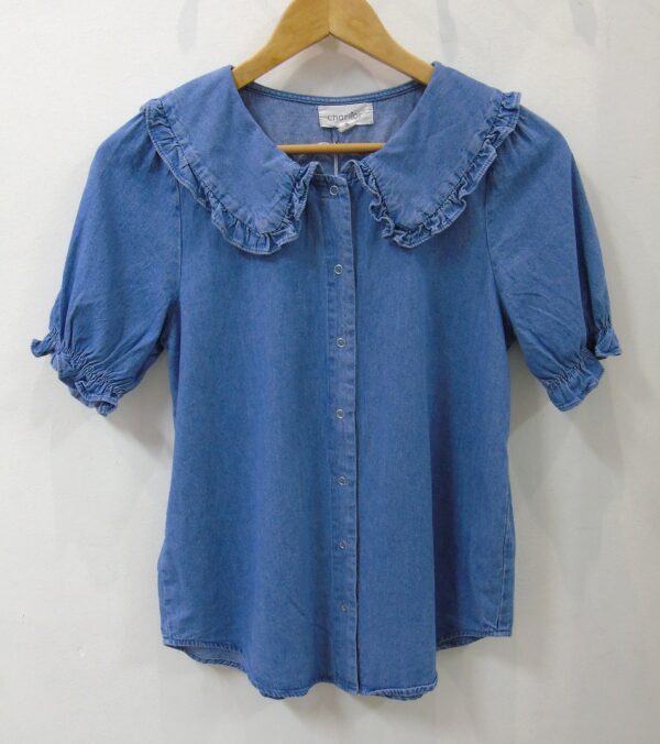 Blusa vaquera con cuello bebe y manga corta con elástico. Talla única