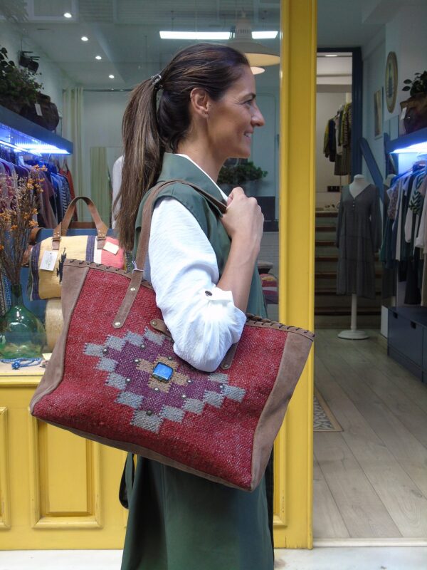 Bolso shopping de kilim y piel, cierre con cremallera y bolsillos interiores