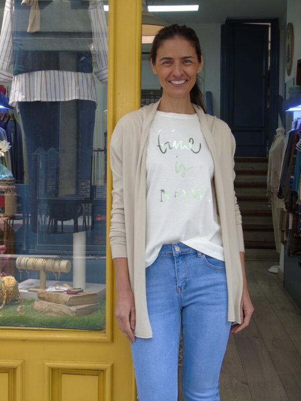 Camiseta blanca de manga corta con letras doradas Time is Now. Talla única