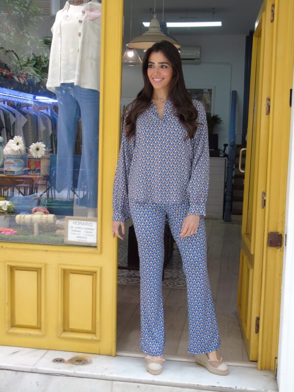 Conjunto de camisa y pantalón estampados en tonos azules y rosas. Talla única ambas cosas