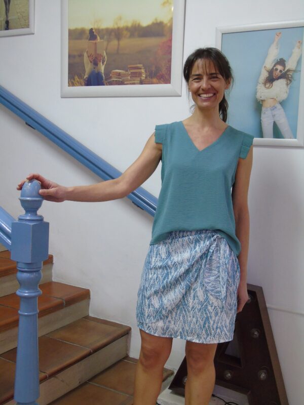 Falda corta estampada en tonos verde aguamarina y blanco. Tallas S, M y L
