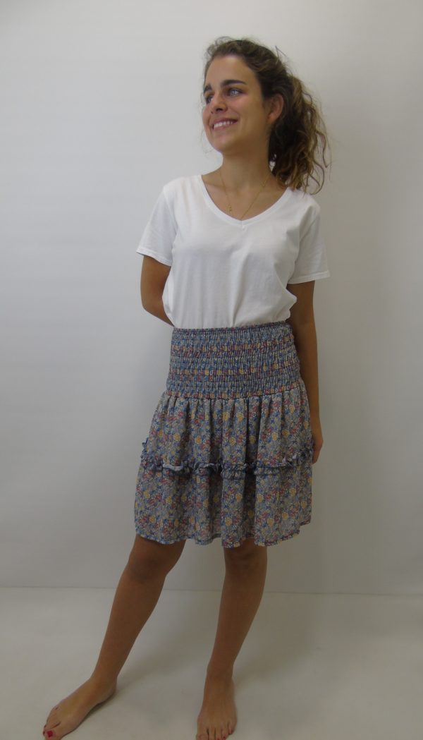 Falda corta con estampado de flores y elástico en la cintura. LLeva forro