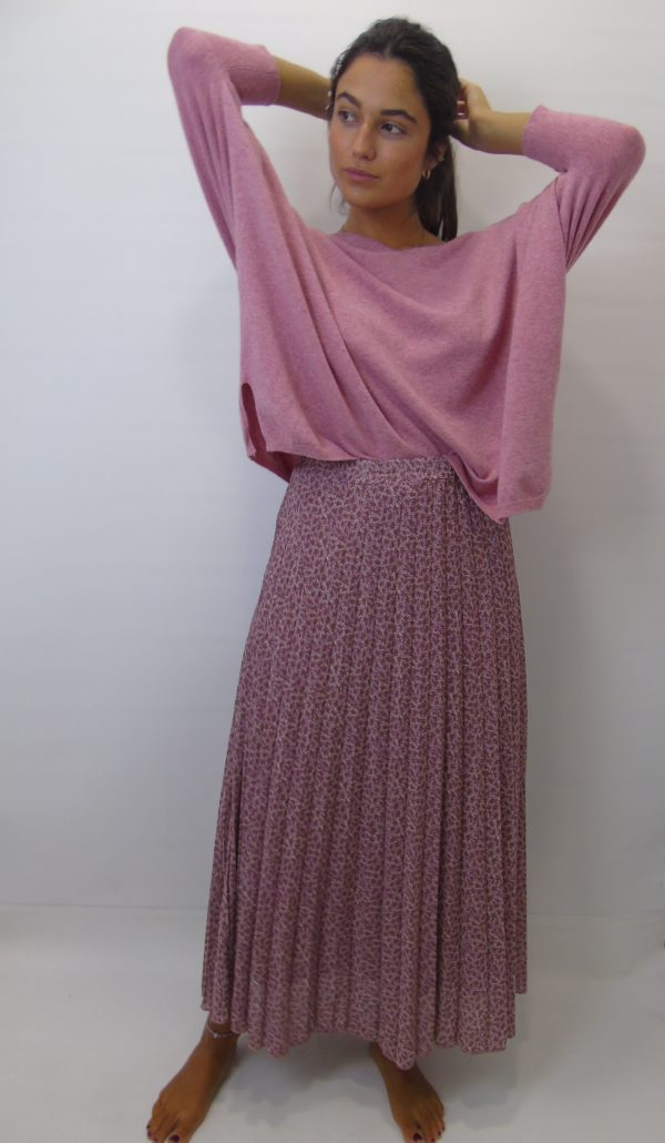 Falda larga plisada, estampada en tonos rosas. Viene con forro
