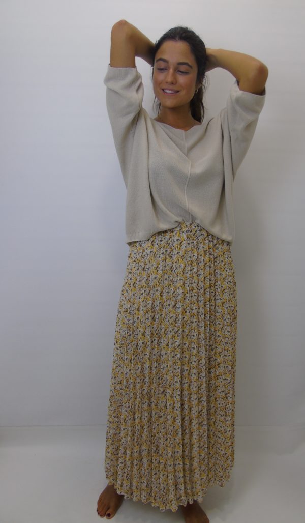Falda larga plisada estampado en tonos amarillos y crudos. Viene Forrada