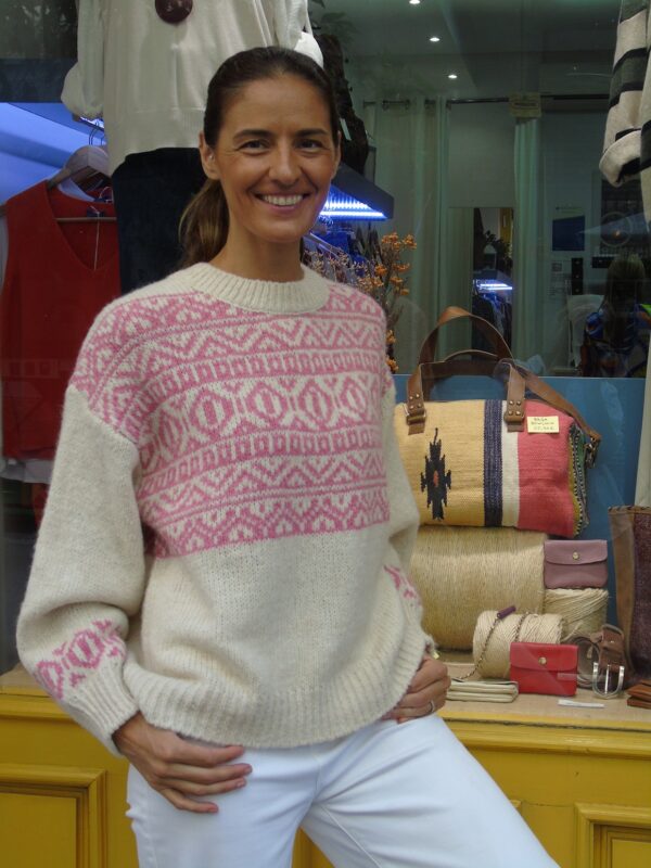 Jersey de punto gordo crudo con cenefa rosa. Talla única
