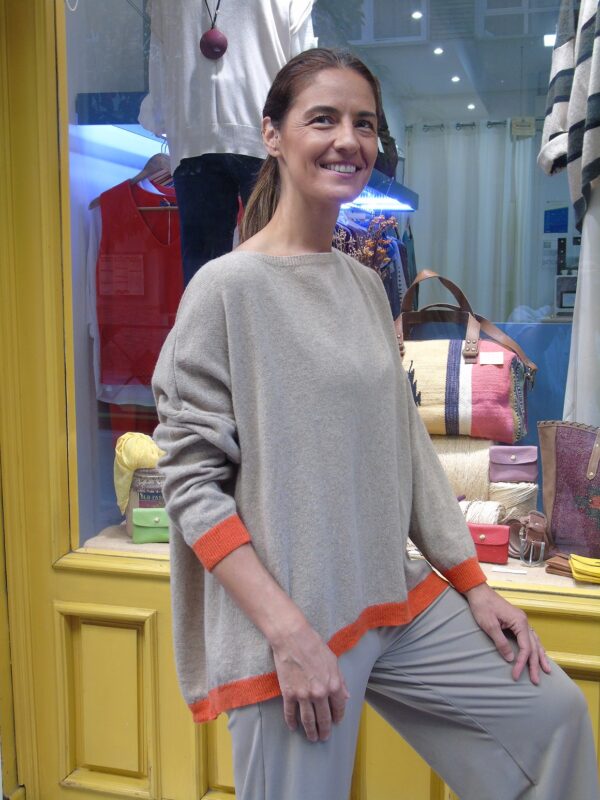 Jersey ancho beige con detalle naranja en puños y cintura. Talla única