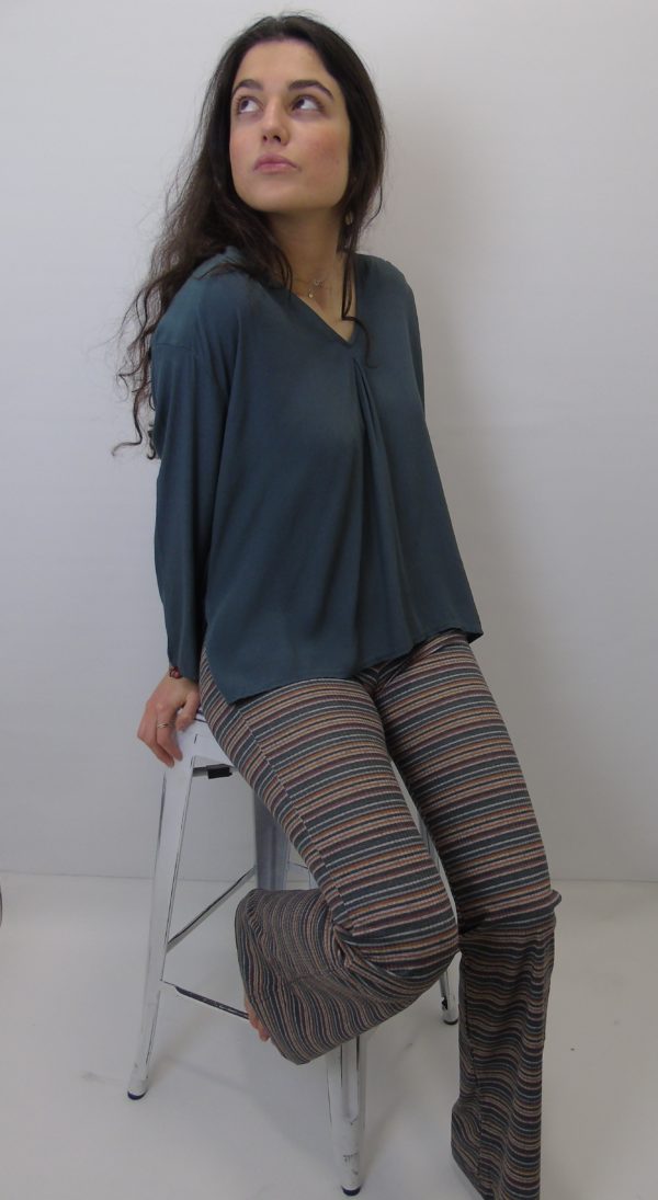 Pantalón elástico y acampanado de rayas en tonos verdes y teja
