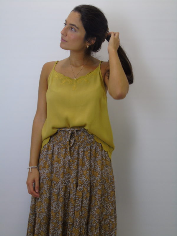 Top de tirantes ajustables, en color mostaza con bordado en escote y en la parte de abajo