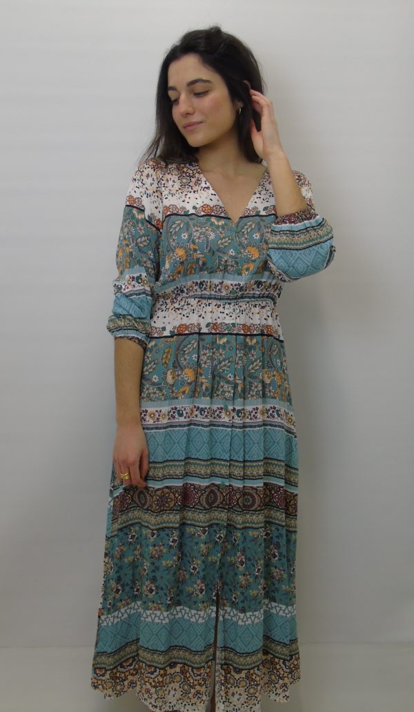 Vestido largo estampado, escote en pico, manga francesa y abotonado hasta abajo