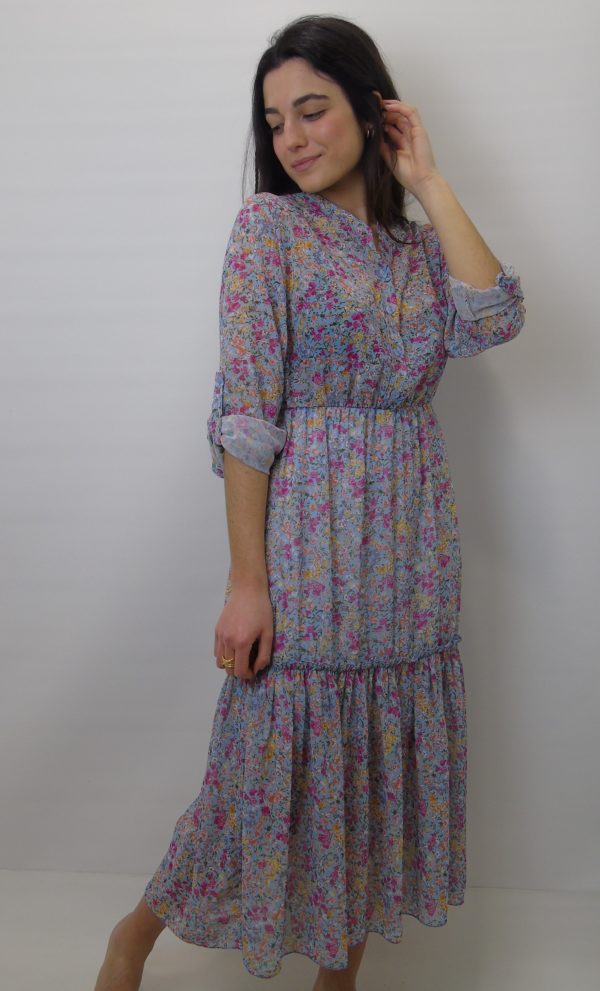 Vestido Largo estampado, cuello Mao y elástico en cintura y piernas. Lleva forro