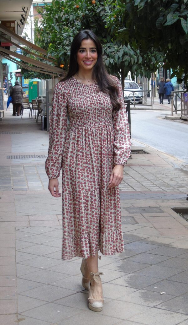 Vestido largo nido de abeja, estampado de flores en tonos teja y manga larga. Talla única