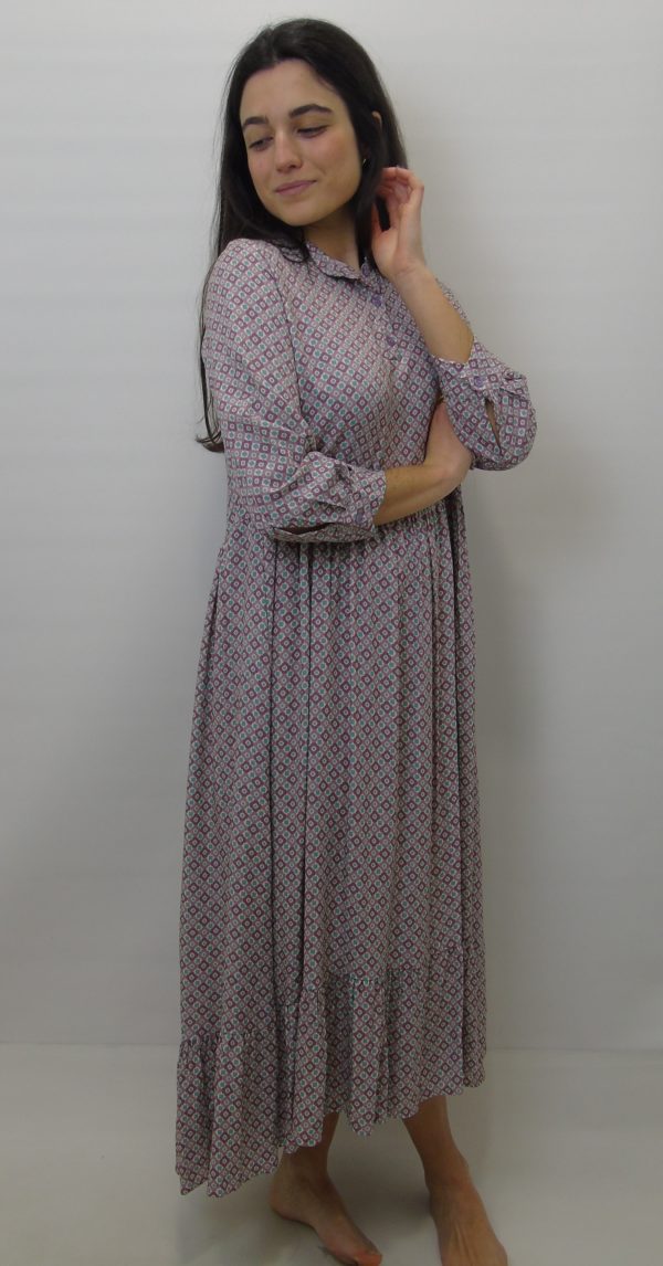 Vestido largo estampado en tonos morados y verde agua, cuello mao y manga larga