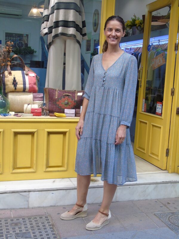 Vestido midi estampado en tonos verdes y rosas. Manga larga y  escote abotonado. Talla única