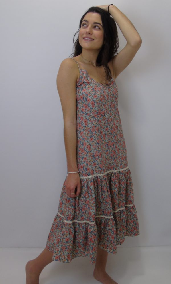 Vestido largo con tirantes ajustables y estampado de flores en tonos teja y azul