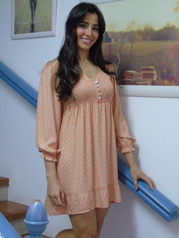 Vestido corto estampado en tonos naranjas y verdes de manga larga con elástico en el puño. Talla única.